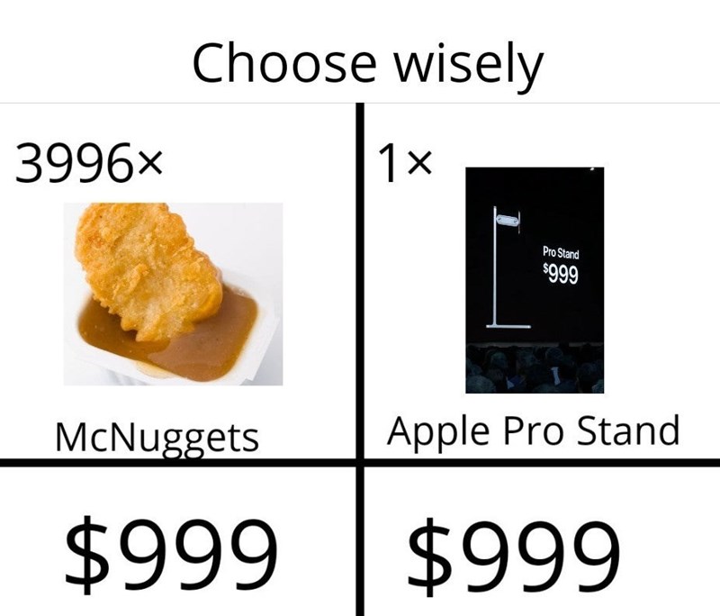 Apple mac pro stand meme. But if there was any question that tim cook s apple isn t looking to save its customers money it s been answered by this week s tone deaf announcement of a 999 pro stand accessory. A monitor stand that costs more than many computers. What is apple thinking. The tech company has become something that people love to hate and hate to love. The best macbook for you is now better than ever thanks to recent improvements to apple s lineup of device. If you buy the base model mac pro one apple monitor and the apple pro stand you re going to have to drop 11 000. The mac pro starts at a hefty 5999 and is best enjoyed with a new pro display xdr that starts at 4999 and comes without a monitor stand.