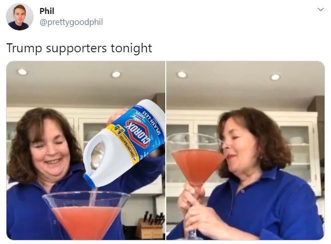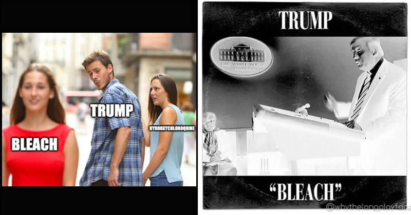 Donald trump meme bleach. It s not fake news. Donald trump supporters are struggling right now. Please note that these memes are satirical and that doctors have warned that injecting or ingesting any kind of disinfectant or bleach can be continue reading 40 brutal memes mocking. Top 28 memes mocking trump s injecting bleach comments by lindsey weedston april 24 2020 10 06 am as you definitely know by now donald trump wondered aloud at his thursday press conference about whether injecting disinfectant into people s veins could kill the coronavirus. Trump did actually suggest that injecting bleach could be a cure for covid 19 the president added that the procedure is something you re going to have to use. They are having to simultaneously think coronavirus is just the flu while also thinking it is a chinese bio weapon designed to turn them communist. And they haven t let up since he took office in january 2017.