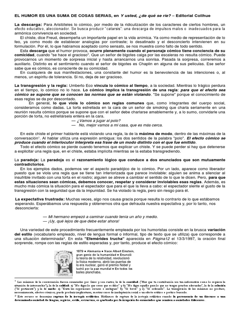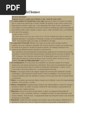 La hipérbole es uno de los recursos más efectivos en los textos con humor. La expectativa frustrada o sorpresa. Una variedad de este procedimiento frecuentemente empleada por los humoristas consiste en la brusca variación del estilo lengua formal o informal tipo de texto que se utiliza en 1879. O cuando hacemos un tutorial de maquillaje y el resultado es muy alejado de lo que buscábamos obtener. Sobre la sacralización del acto de leer literatura luciana mitri estudiantes de educación física alumnos de primer año algunos recientemente salidos de la escuela secundaria otros probando su segunda o tercera carrera. El grado del humor dependerá de dos cosas aspectos o situaciones que entran en cierta contradicción o están apoyadas por ideas bastante diferentes por ejemplo en aquellas situaciones que se está esperando algo y surge otra cosa completamente diferente. Nace einstein gran genio de la humanidad enunció la teoría de la relatividad.